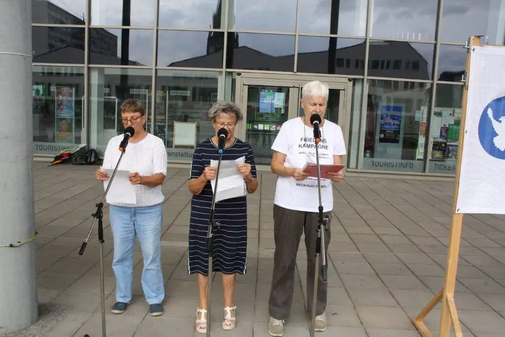 Gemeinsam mit dem BSW organisierte das Friedensbündnis Neubrandenburg ein Friedensforum mit einer Friedensradfahrt zum Markt am 21. September 2025, dem “Internationalen Tag des Friedens”. Mit dem Einfahren der Friedensradfahrer und dem Einspielen der Fanfare der bekannten “Course de la Paix” war das Friedensforum unter großem Beifall eröffnet. Roswitha verlas den Brief an die eingeladenen gewählten “Volksvertreter”, so die Ministerpräsidentin des Landes MV, alle Landtagsabgeordneten, die gewählten Vertreter des Kreistages und der Stadtvertretung Neubrandenburg. Sie sollten sich vor allem zum Artikel 18a und der Präambel der Landesverfassung von MV bekennen. Leider waren nur drei gewählte Vertreter erschienen. Harald Wandel, Liedermacher, startete die Kundgebung musikalisch. Dann sprach Jens Kreutzer (BSW) als stellvertretender Stadtpräsident von Neubrandenburg. Er ging auf die Zerstörung der Stadt im 2. Weltkrieg ein und auf die Gefahr, die von der neuen Rüstungsfirma “General Dynamics” für die Stadt ausgeht, in Erinnerung der Rüstungsfirmen während des “3. Reiches”. Er wies auf die ablehnende Haltung einiger Fraktionen der Stadtvertretung hin, sich eindeutig für den Frieden auf der Welt und einer Friedensfahne im Stadtbild zu bekennen. Bis auf BSW und Projekt NB keine klaren Aussagen. Großartig und sehr beeindruckend der Auftritt der drei antiken Kassandras von Roswitha, Eva und Antje mit aktuellem Bezug, übernommen mit freundlicher Genehmigung der Berlinerinnen Biggi, Julia und Corinna. Ein weiterer Redner dann von Robert Schnell (AfD), Fraktionsvorsitzender im Kreistag des Landkreises MSE. Sein Anliegen: Es darf für die Sicherung des Friedens keine Spaltung in “Rechts” oder “Links” mehr geben. Genau das ist von der Politik und den Medien gewollt, die Spaltung der Friedensbewegung! Nach einigen weiteren großartigen musikalischen Beiträgen von Harald Wandel sprach noch das Mitglied der BSW-Fraktion der Stadtvertretung Hans-Jürgen Schwanke. Er stellte eine Frage an den Anfang: Warum sind bei einer wichtigen Veranstaltung für den Frieden so wenige Teilnehmer da? Er ist hier in Neubrandenburg vor 74 Jahren geboren und hat eine glückliche, friedliche Zeit erlebt. Und jetzt wird vom Krieg gepredigt. “Kriegstüchtigkeit”. Das ist unglaublich. Sagt nein! Der letzte Redner war Robert, Friedensaktivist, Organisator der ersten Demos 2020 gegen die irren Coronamaßnahmen, der Unternehmeraufstände und Bauernproteste in MV vor zwei Jahren. Er legte dar, wie die USA seit 1952 vom Koreakrieg an bis hin zum Maidan-Putsch in Kiew und der Invasion in Syrien ständig um Interessensphären und ökonomische Märkte kämpfen. Er rief alle Anwesenden auf, an den Kreistags- und Stadtvertretersitzungen teilzunehmen, aber auch die wöchentlichen Montagsdemo zu besuchen. (FriedensBündnisNB)